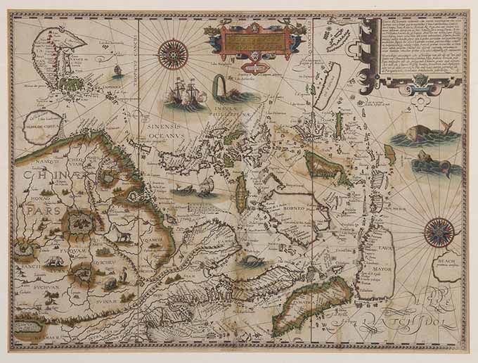 Lotnr. 505: Jan Huygen van Linschoten (1563-1610), handgekleurde gravure, een zeldzame kaart van China en Zuidoost-Azië, 39 x 52.5 cm.